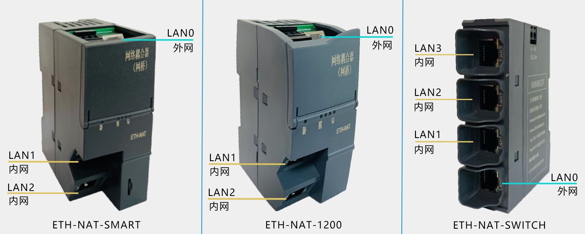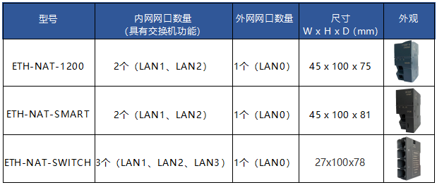 說明:以上型號實(shí)現(xiàn)功能都相同,只是外觀及網(wǎng)口數(shù)量區(qū)別,現(xiàn)場PLC如使用S7-1200推薦使用ETH-NAT-1200;如使用S7-200SMART推薦使用ETH-NAT-SMART;這樣搭配一樣風(fēng)格的外觀,更加協(xié)調(diào)。