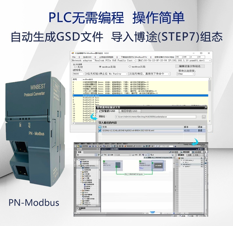 ●    用于西門子S7-200Smart /S7-1200/S7-1500/S7-300PN,通過Profinet 網(wǎng)線與本產(chǎn)品PN-Modbus連接,實現(xiàn)與現(xiàn)場設(shè)備、變頻器、儀表、PLC、DCS進(jìn)行Modbus RTU通信。