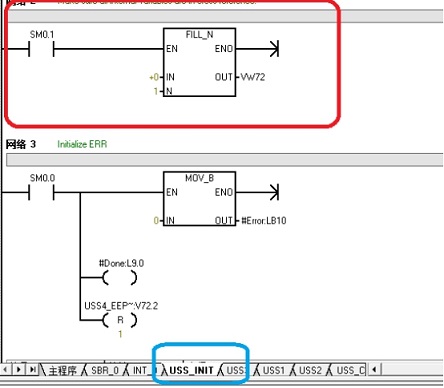 西門子USS庫的密碼是2BW9,我們需要先把USS_INIT子程序打開,然后將原本的網(wǎng)絡(luò)2中的程序改成圖中紅色框中的程序即可。