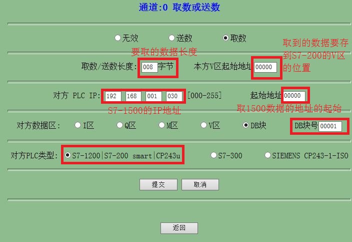 2、點(diǎn)擊最后一項(xiàng),PLC通訊,比如我想S7-1500的DB1從取出DB1.DBB0到DB1.DBB7,存放到S7-200的VB0到VB7,設(shè)置如下圖: