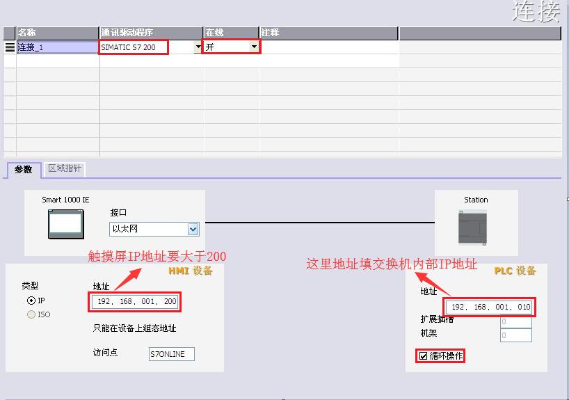 2.在 WinCC Flexible 中【連接】——【接口】選“以太網(wǎng)”、通訊驅(qū)動程序選“S7-200”、PLC設(shè)備[地址]填入多功能交換機內(nèi)置 IP 地址 [默認:192.168.1.10] ,【循環(huán)操作】打?qū)μ枴啊獭保涣硗釹MART LINE 觸摸屏(HMI)的 IP 地址也應設(shè)置在同一段內(nèi),例如:192.168.1.200(而且最后一網(wǎng)段地址是大于200的)。