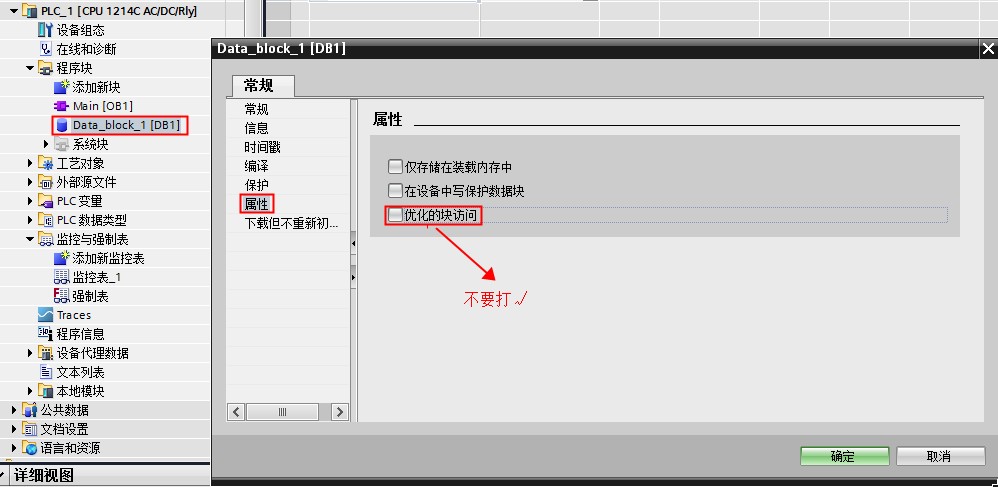 3.在 S7-1200/S7-1500PLC的編程軟件TIA Portal中,初始定義 DB 塊時, 【優(yōu)化的塊訪問】的選項不要打?qū)μ枴啊獭薄?/p>