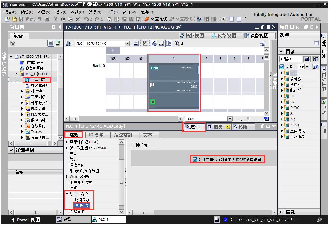 4.博途中的設(shè)備組態(tài)--->屬性--->防護與安全--->連接機制---->允許來自遠程對象的PUT/GET通信訪問打“√”。